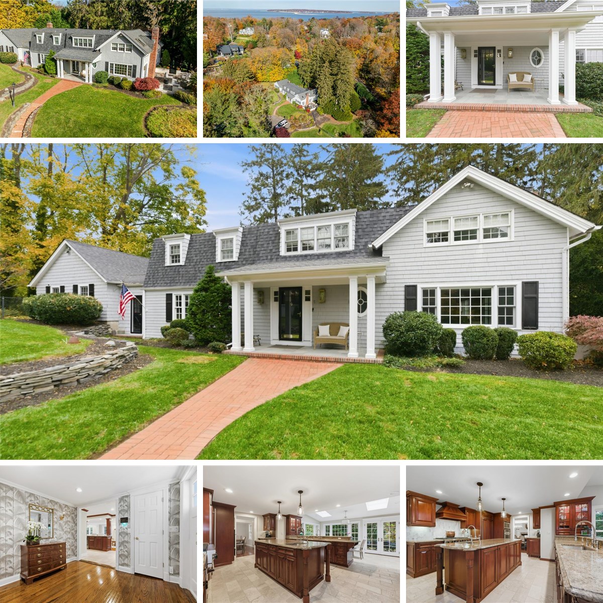 Located in the heart of Huntington Bay, 5 Kanes Lane is a fully updated, 4 bedroom, 3.5 bath quintessential carriage house. Privately perched on 1.12 acres with year-round water views of Huntington Harbor, the home is located at the gateway of this revered enclave and is neighbored by equally beautiful period homes on sweeping properties. Flooded with natural light by way of multiple windows, 5 Kanes is highlighted by rich wood floors, deep moldings, beamed and vaulted ceilings, two gas fireplaces, and smartly scaled principal rooms. The radiant-heated, timeless Wood Mode eat-in kitchen and breakfast room are accented by top shelf stainless steel appliances. The living room, with gas fireplace and water views, abuts the vaulted family room, both with wide plank floors and walls of windows. The expansive dining room has milled beams and a large gas fireplace, with multiple windows on both sides of the room. Privately tucked away on the home's north side are two first floor bedrooms serviced by a classic full hall bathroom with skylight and laundry closet. With a private entrance, this area can also serve as a guest suite. The second floor's large landing separates the third bedroom and en suite primary. A beautiful marble bathroom with a seamless glass shower and marble vanity services the third bedroom. The primary suite exudes warmth and comfort as does the recently renovated en suite bathroom flush with marble floors, a large marble shower with rain head, and separate soaking tub. Just off the bathroom is a spacious dressing room with walls of closets and an office nook.